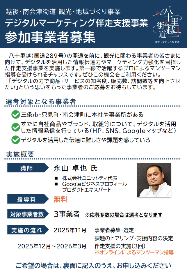 八十里越(国道289号)の開通を前に、観光に関わる事業者の皆さまに向けて、デジタルを活用した情報伝達力やマーケティング力強化を目指した伴走支援事業を実施します。